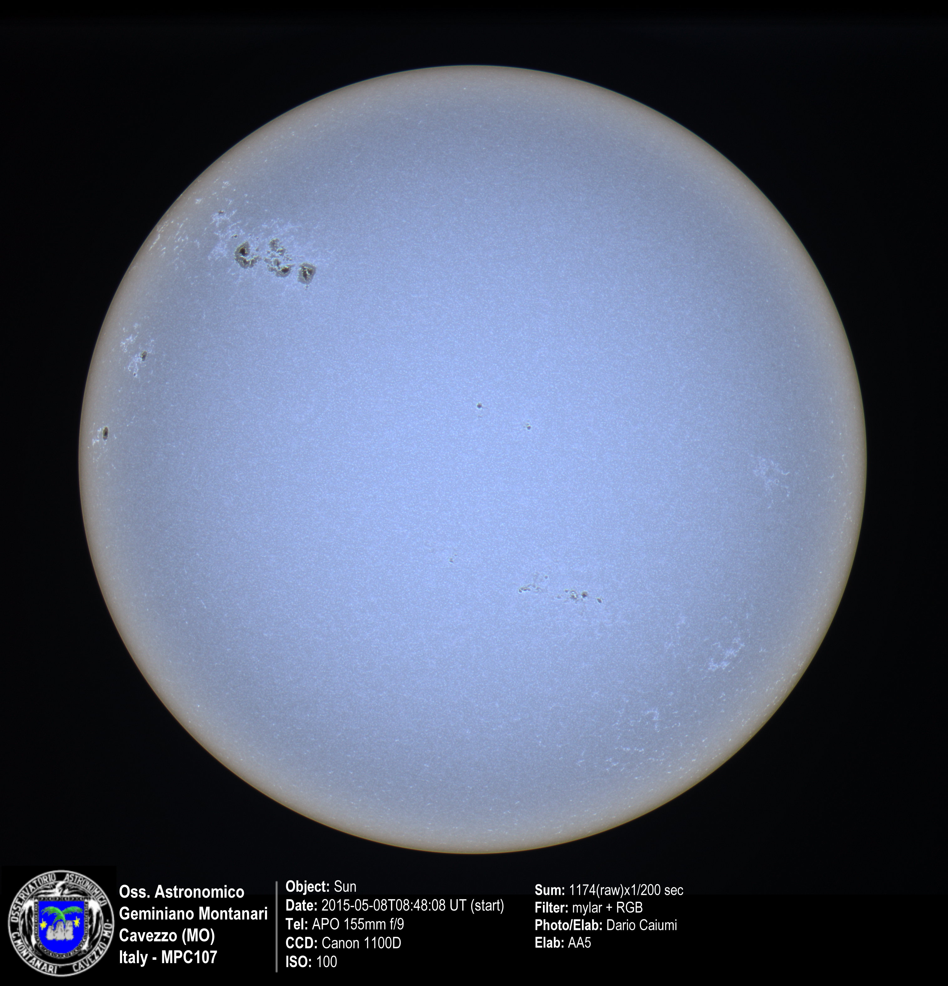 Immagine del Sole realizzata con filtro mylar. In alto a destra si possono osservare due gruppi di macchie solari.