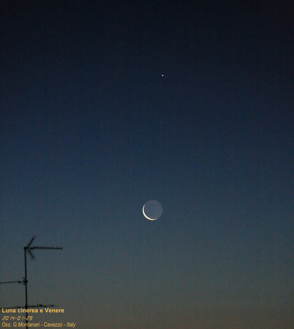Splendida alba con all'orizzonte la Luna cinerea e Venere. La luce cinerea è un fenomeno che si ha solo nelle prime fasi della Luna crescente o nelle ultime fasi della Luna calante, è la Terra, illuminata dal Sole che rifette la luce verso la superfice lunare rendendo visibile anche la parte in ombra..