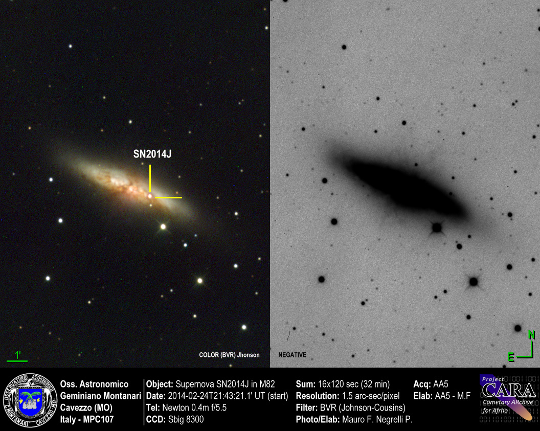 In questa immagine (in negativo) ripresa il 26 gennaio nel nostro Osservatorio da Paolo Negrelli, una croce punta a un'eccitante, nuova supernova, ora catalogata come SN 2014J, nella vicina brillante galassia M82. Situata nei pressi del Grande Carro nel cielo del pianeta Terra, M82 è anche conosciuta come Galassia Sigaro, un soggetto popolare per i telescopi nell'emisfero settentrionale.