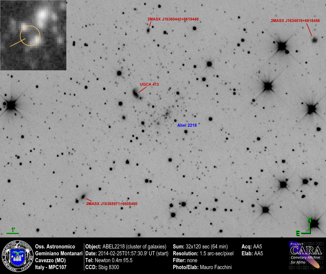 Immagine dell'ammasso di galassie ABEL2218 contenente al suo interno diverse lenti gravitazionali. La nostra risoluzione era al limite e il riconoscimento difficoltoso. Sapendo dove sono sembra che uno di essi si intravveda.