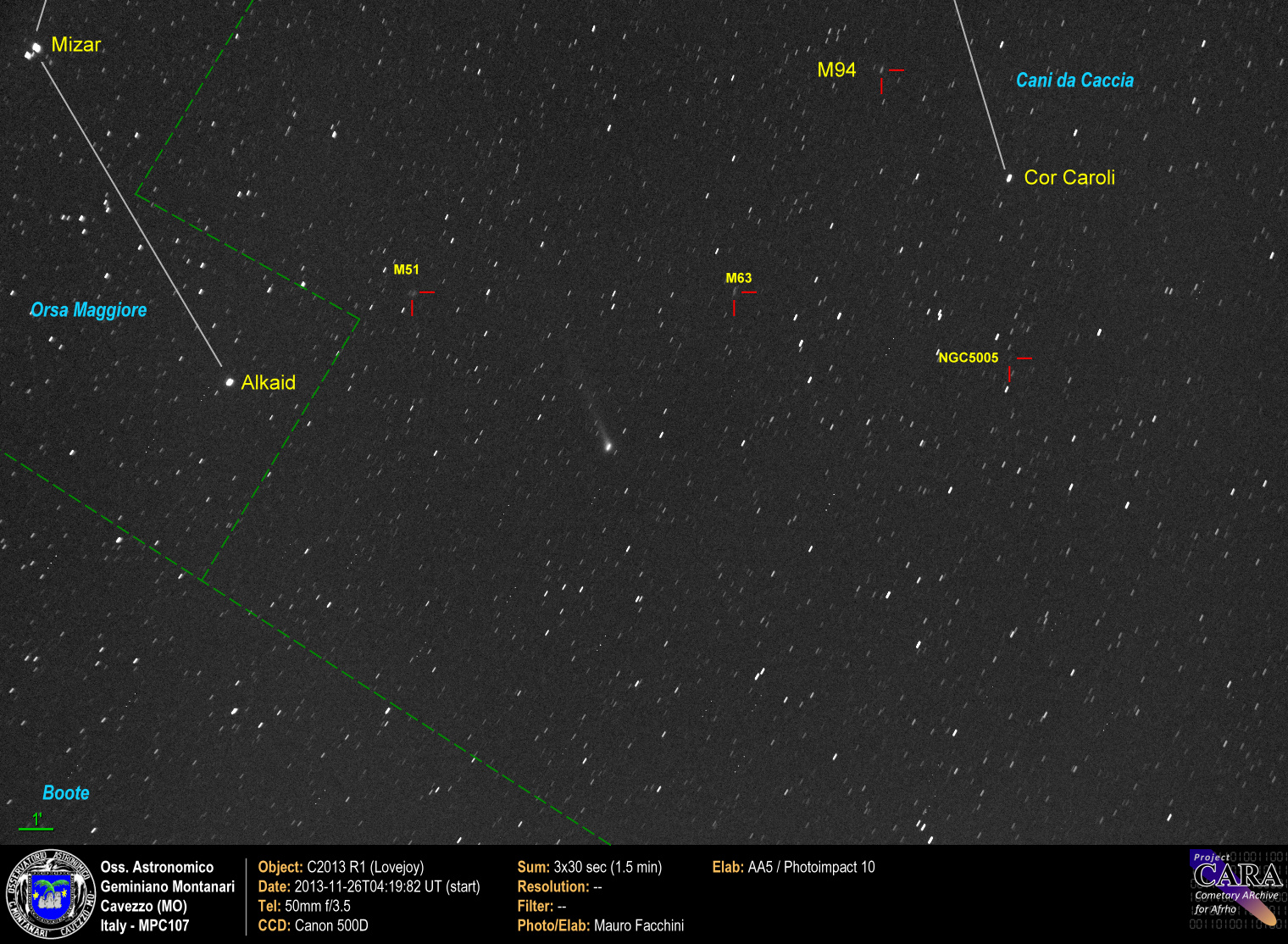 Il campo inquadrato con la Canon e il 50mm su cavalletto dove si vede la cometa alcuni oggetti di Messier e le costellazioni coinvolte.