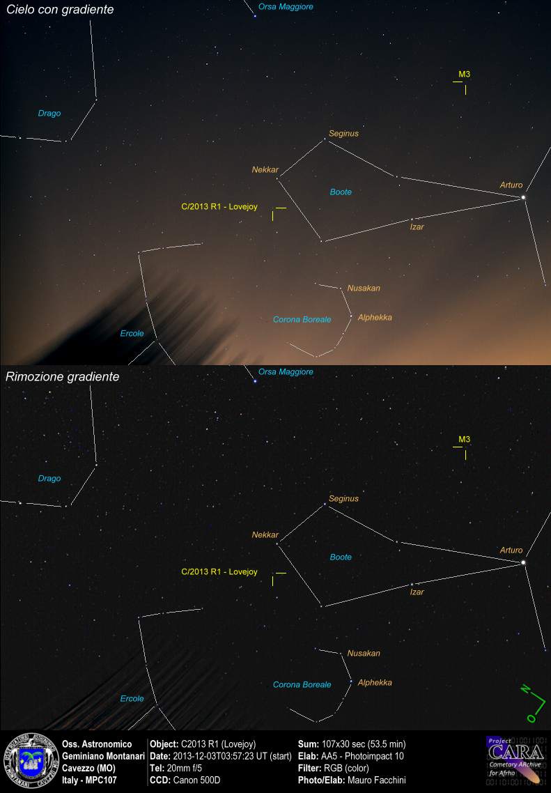 Time-laps delle condizioni di ripresa. Ripresa fatta con Canon 500D e 20mm, immagine centrata sulla Cometa. Le immagini sotto sono state ottenute da questa sequenza.