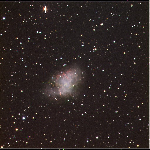 Primissimi esperimenti al fuoco newton con i filtri a colori. In questa immagine è visibile il campo della celeberrima nebulosa del Granchio (Crab Nebula). Questa nebulosa, nota anche come primo oggetto della lista di Messier (M1) consiste dei residui di un'eplosione stellare risalente al lontano 1054 dC.
