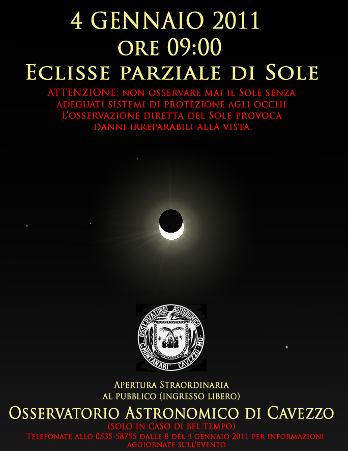 Il prossimo 4 gennaio 2011 il Sole sorgerà a Cavezzo già parzialmente eclissato dalla Luna. Tuttavia la fase di massimo dell'eclissi (che rimarrà sempre parziale) avverrà intorno alle 09:10 e terminerà intorno alle 10:40. L'Osservatorio sarà aperto per il libero accesso al pubblico dalle ore 9:00 e sarà possibile osservare l'evento attraverso i nostri telescopi. ATTENZIONE!!! Il tempo è previsto parzialmente nuvoloso e in ogni caso saranno probabili banchi di nebbia per quell'ora mattutina. In tal caso l'osservazione dell'evento NON SARA' POSSIBILE! Per informazioni aggiornate telefonate il giorno stesso dalle ore 8:00 al numero 0535-58755