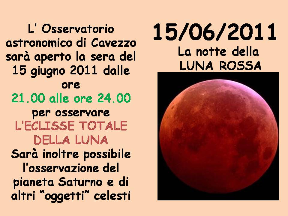 L'Osservatorio astronomico di Cavezzo sarà aperto la sera del 15 giugno 2011 dalle ore 21 alle ore 24 per osservare L'Eclisse totale di Luna.